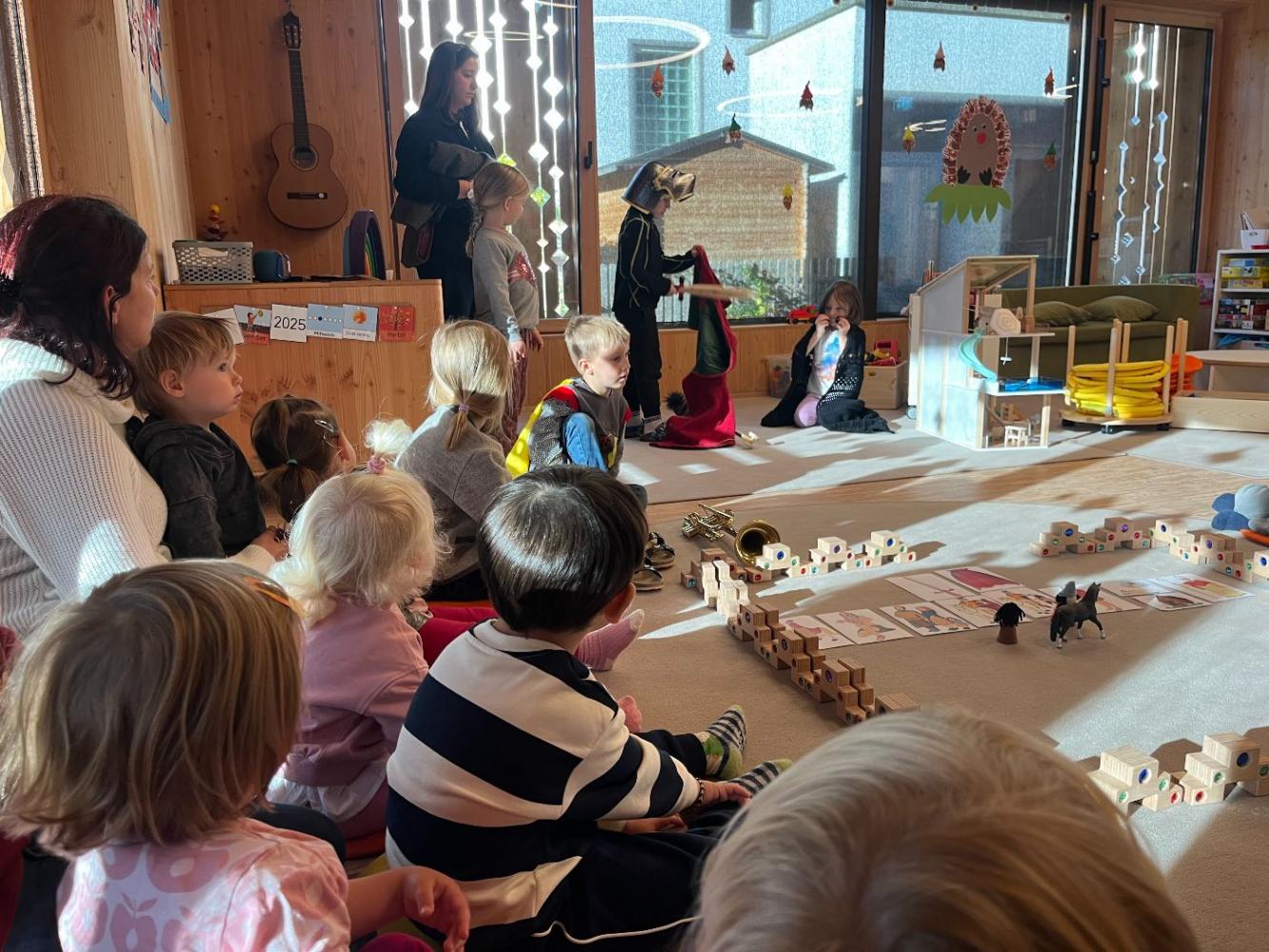 Aufgeregt und stolz spielten die Vorschulkinder der Murmelegruppe die Geschichte von Sankt Martin, der seinen Mantel mit einem frierenden Bettler teilte. In passenden Kostümen zeigten sie, wie schön es ist, miteinander zu teilen und füreinander da zu sein.